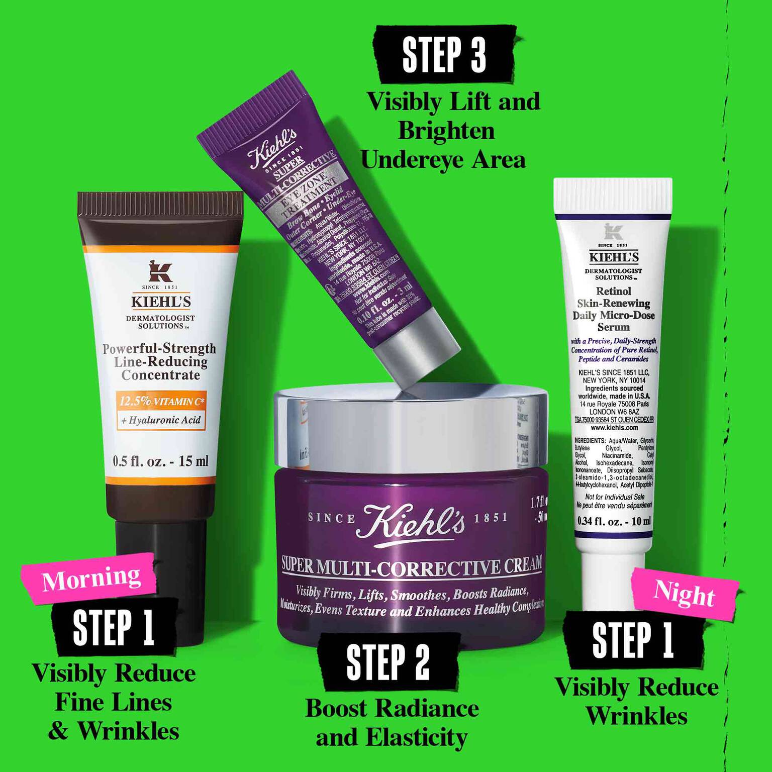 KIEHL’S Level Up Your Smooth Essentiels anti-âge pour le soin de la peau notre sérum Micro Dose au rétinol, un sérum à la vitamine C, une crème pour le contour des yeux raffermissante et une crème hydratante aux multiples bienfaits pour aider à réduire visiblement les rides et lisser les ridules, offrant ainsi une peau d’apparence plus jeune.
