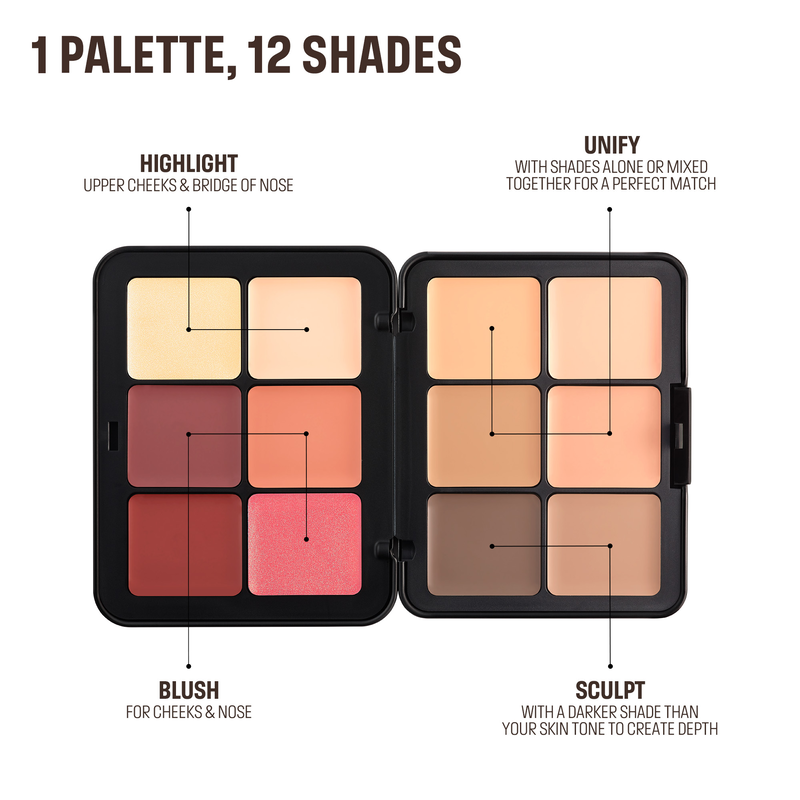 Notre palette virale HD SKIN FACE ESSENTIALS correspond à tout ce que vous attendez. Nos 12 teintes sont modulables, légères et se mélangent très bien ensemble, elles ne sont pas du tout pâteuses.